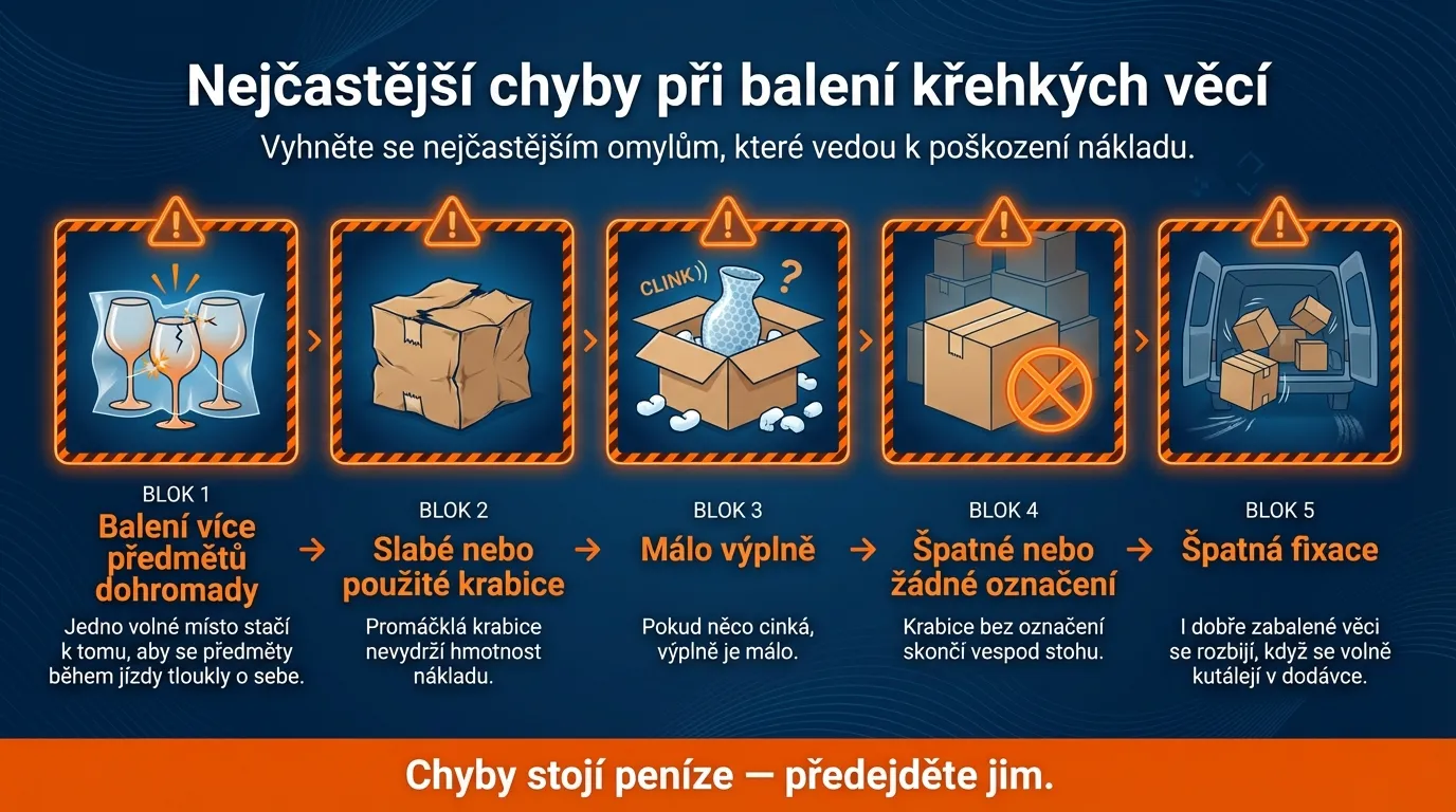 Pět hlavních chyb: 1) Balení více předmětů najednou bez samostatné ochrany, 2) Použití slabých jednovrstvých krabic, 3) Nedostatečná výplň v krabici – předměty mají volný prostor, 4) Chybějící ochrana rohů a hran, 5) Špatné umístění v dodávce – křehké věci dole nebo u zadních dveří.